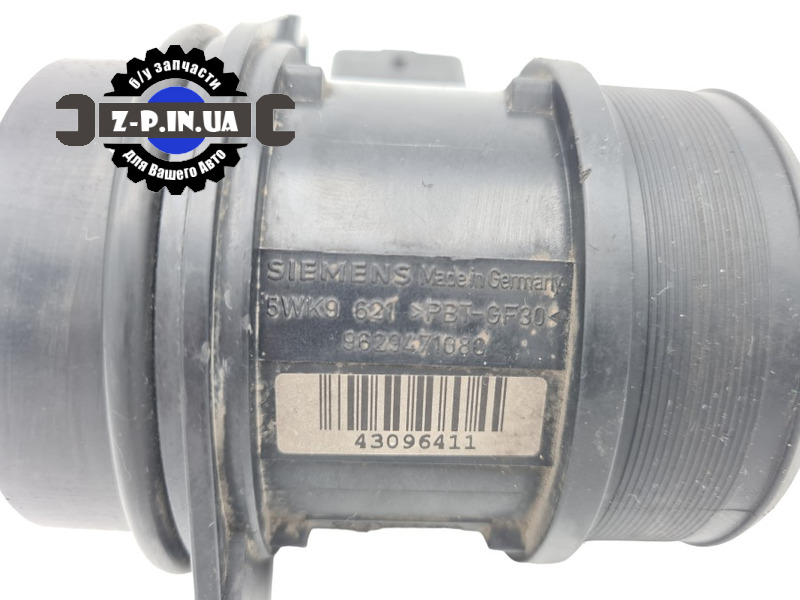 Датчик масової витрати повітря Siemens. Є номери деталі 5WK9621 та 9629471080. Сумісний з автомобілями марки Peugeot 1.6 16 V, 1.9 D, 2.0 HDI, Citroen 1.9 D, 2.0 HDI. Знято з робочого автомобіля на авторозбірці в Польщі. Стан деталі можна побачити на фото зі складу. Надаємо гарантію на встановлення.